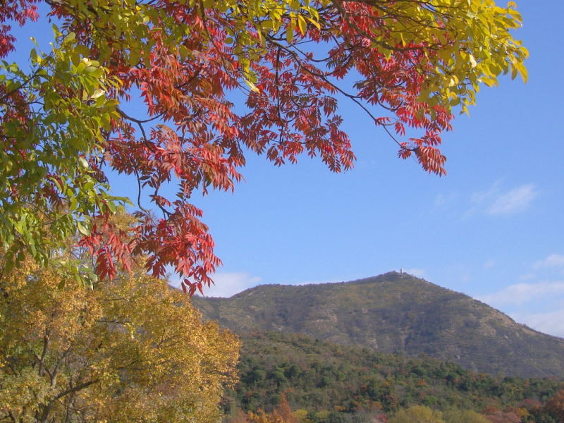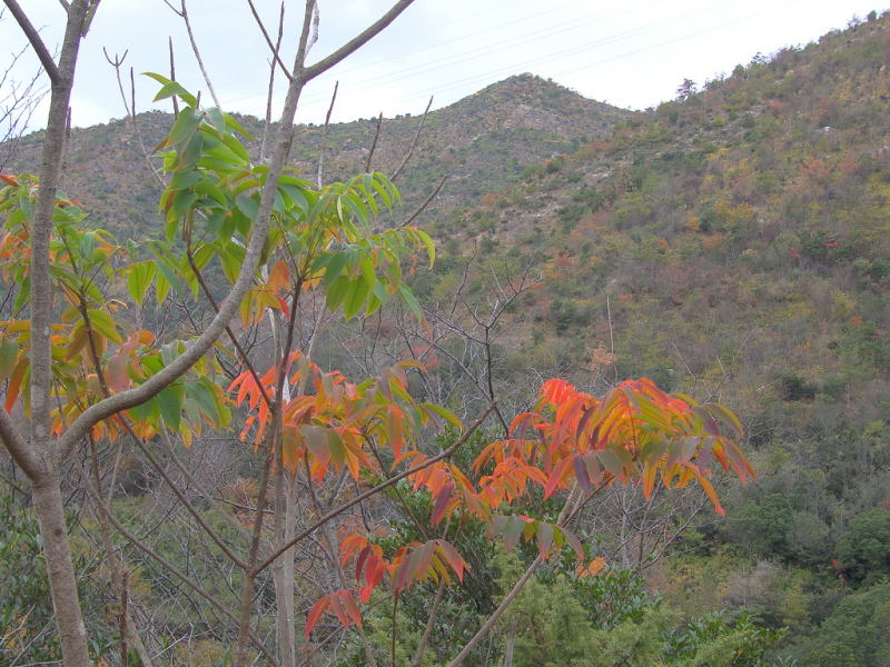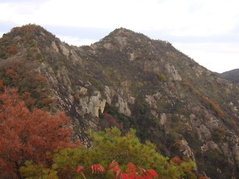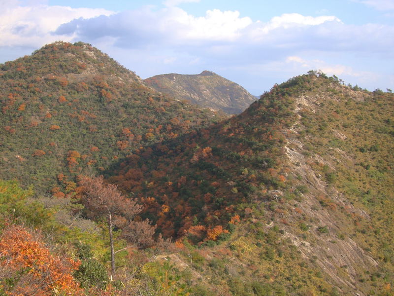稜線からは、淡路島、家島群島、その後に大きく小豆島が見える。目を凝らせば微かに四国も見える。まさに展望の山なのだ。眼下は、姫路の市街地。修理中の姫路城の覆いが大きく感ぜられる。北を望めば山々が連なる。それを無視すれば、夏の北アルプスの趣がある。しかし、秋には違いない。斜面の南は緑に、北は紅葉にと見事に分かれている。