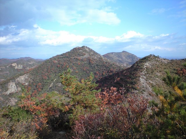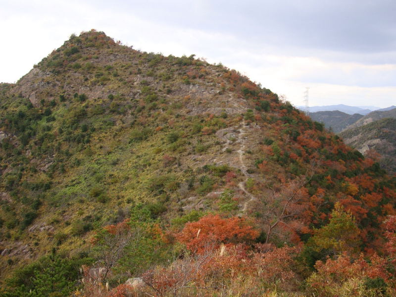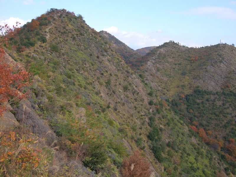 山に取り付くと、いきなり急な坂。この頃、山へ出かけていないことが原因。すぐに汗をかいてしまった。しかし、さすがの低山、約20分ほどで稜線に出る。稜線には高い木がないのですこぶる展望が良い。