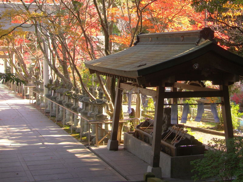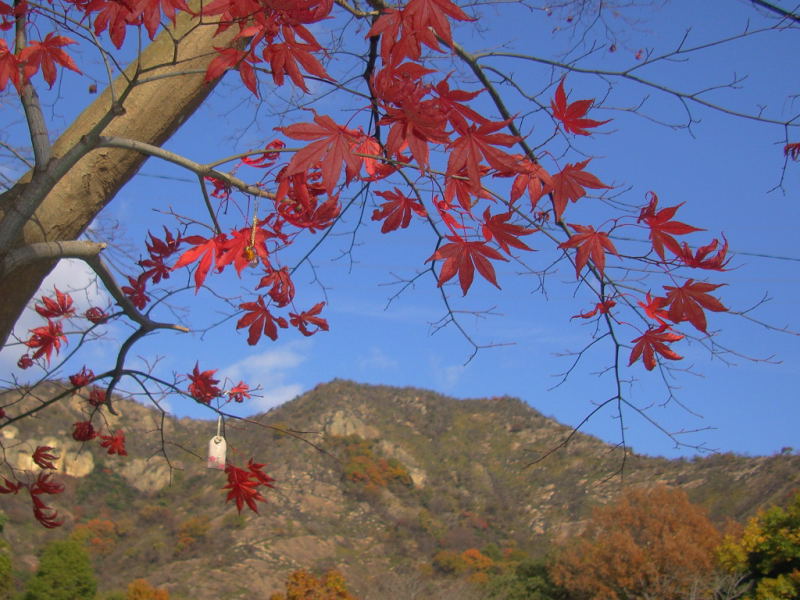最後の坂を赤い鳥居側に下れば、鹿嶋神社の拝殿に直接出ることができる。無事下山できたことを感謝し、お賽銭をあげた。紅葉がきれいだった。見上げれば紅葉の後に端麗な姿の高御位山が聳えていた。