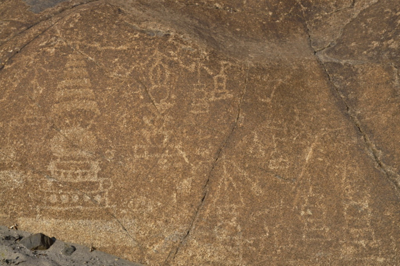 岩絵はインダスの流れがゆるやかな渡河地点に多く、インダス沿いに25000箇所も有るとされていますが、道沿い、河沿いの立ち寄り易い場所が見所になって居る。かって、旅人が渡河待ちの間に掘ったとされており、動物、ストーパ、経文らしい古代文字が掘られています。