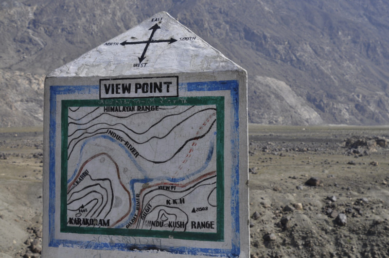 バスが高度をあげて、ヒンズークシュ、ヒマラヤ西部、カラコルムの三大山脈の合流点に、大まかには、インダス本流の左岸がヒマラヤ、右岸はカラコルム、ギルギット川右岸はヒンズークシュ、左岸はカラコルムという感じです。これを地図で説明したモニュメントの写真を添付しています。