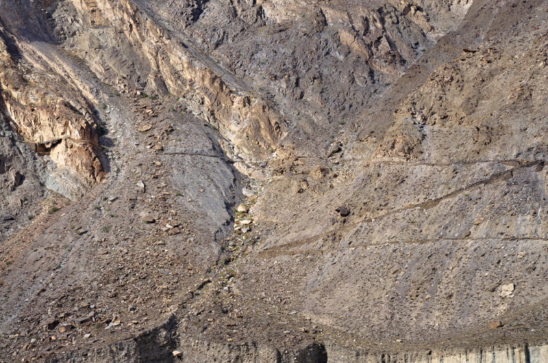 この日は標高1200m以上の山間部走行で始まります、インダス川まで高さ400mもある崖に道はありますが、ガードレール無し、曲がりくねった山道を運転手は道幅全体を使って(センターラインなどは無い)上手く、対向車をかわします。