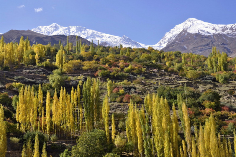 4時過ぎにはカリマバードのフンザに到着、旧フンザハン国の王族が経営するダルバールホテルに。部屋からもウルタル等カラコルムの山々や黄葉したポプラの村が、さらに屋上が広い展望テラスになっており、黄昏迫るラカボシ、スパンテーク、スマイヤル、ウルタル、ディラン、レディスフインガー等、カラコルムの山々を飽きずに眺める事が出来ました。