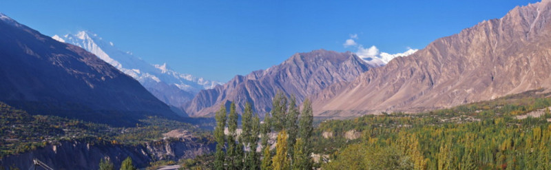 フンザ川とナガール川の合流点から黄葉のポプラや紅葉のアンズに染まるフンザの町、合流点で砂金採りで暮らす人々のテント村を見てナガール村ヘ。
