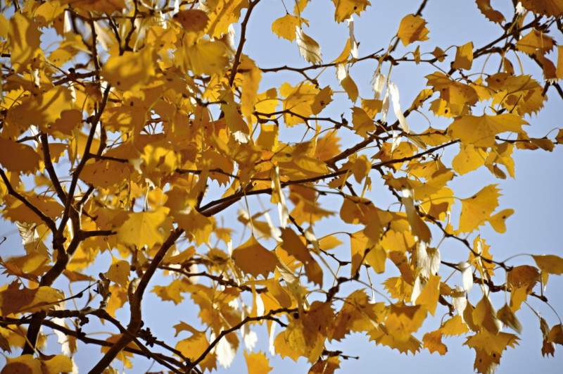 黄葉は色が日本の銀杏よりもずっとオレンジ色に近いずいた色合い、葉の形状はばらバラで場所ににより、同じ樹でもいろいろな葉形があり、銀杏に似た形から日本の柳のように細い形もあり、特定できない。他の仲間のポプラや柳同様に白い綿毛を持った種子が舞う現象も見られるとの事。胡楊を形容するウイグル族の言葉・・・・