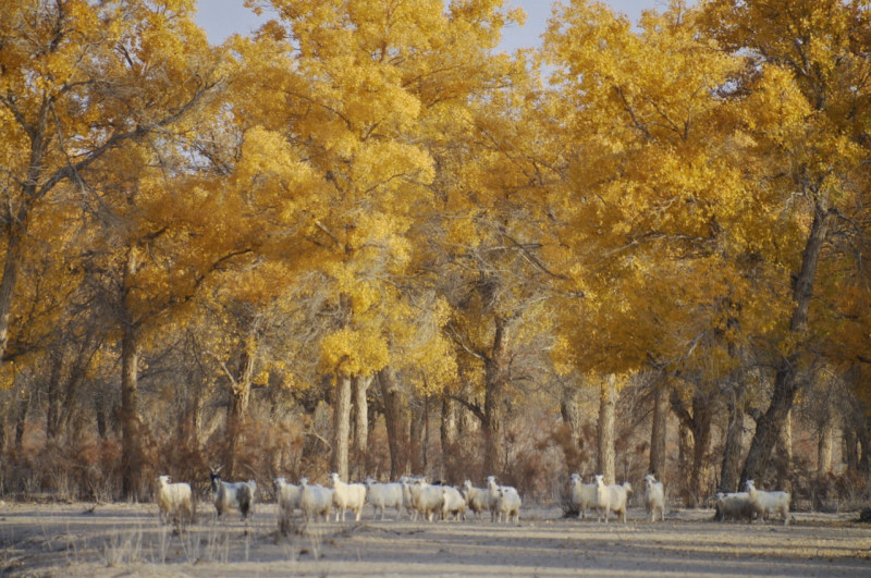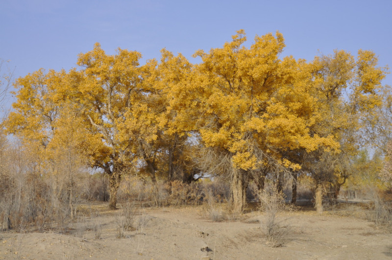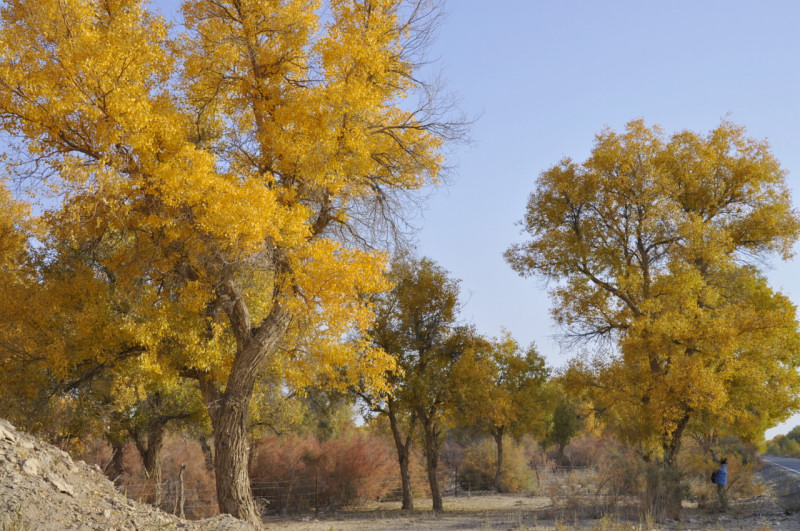 昨日ホータンからニヤヘ向かった辺りから、中央アジアの特有種で砂漠の三大植物の一つで、今の時期に黄葉が一番美しくなるという「胡楊・別名ことかけやなぎ」が徐々に姿を表して来ました。今日はその自生地を多く通り、見事な巨木の黄葉を眺める事が出来ました。パキスタンではポプラの黄葉、此処では胡楊の黄葉です。